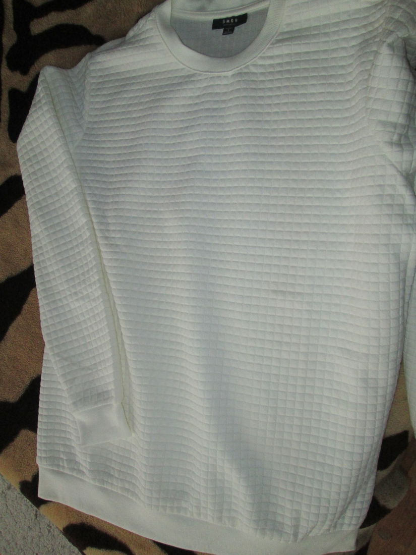 vand o bluza foarte frumoasa, moderna, comoda, eleganta, stare foarte buna, marime L, marca Smog regular fit, calduroasa, maneci lungi, made in Bangladesh, material crem deschis spre alb cu niste patratele putin iesite in relief in tesatura, lungime 75cm, circumferinta 120cm si materialul nu prea mai cedeaza