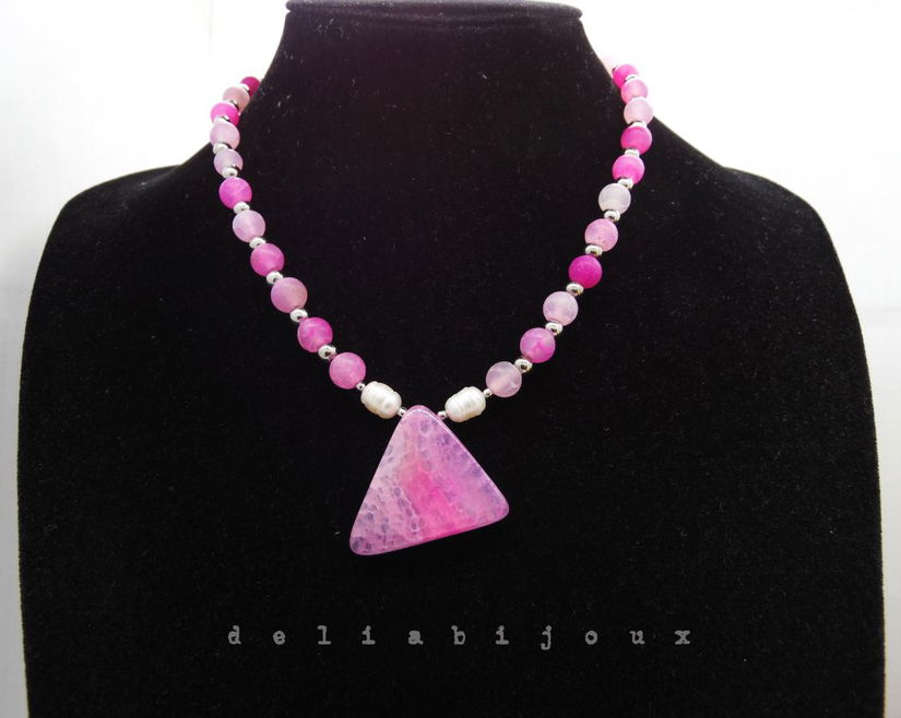 Adaugă un strop de rafinament și originalitate ținutelor tale cu acest colier handmade, unicat, realizat manual cu grijă și atenție la detalii. Piesa centrală este un medalion spectaculos din agat roz, șlefuit în formă de triunghi, ce aduce un aer delicat și feminin. Medalionul este încadrat armonios de două perle de cultură albe, simboluri ale eleganței atemporale.