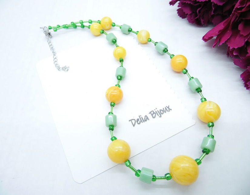 Colier handmade cu mărgele galbene și accente verzi model unicat (cod1237)